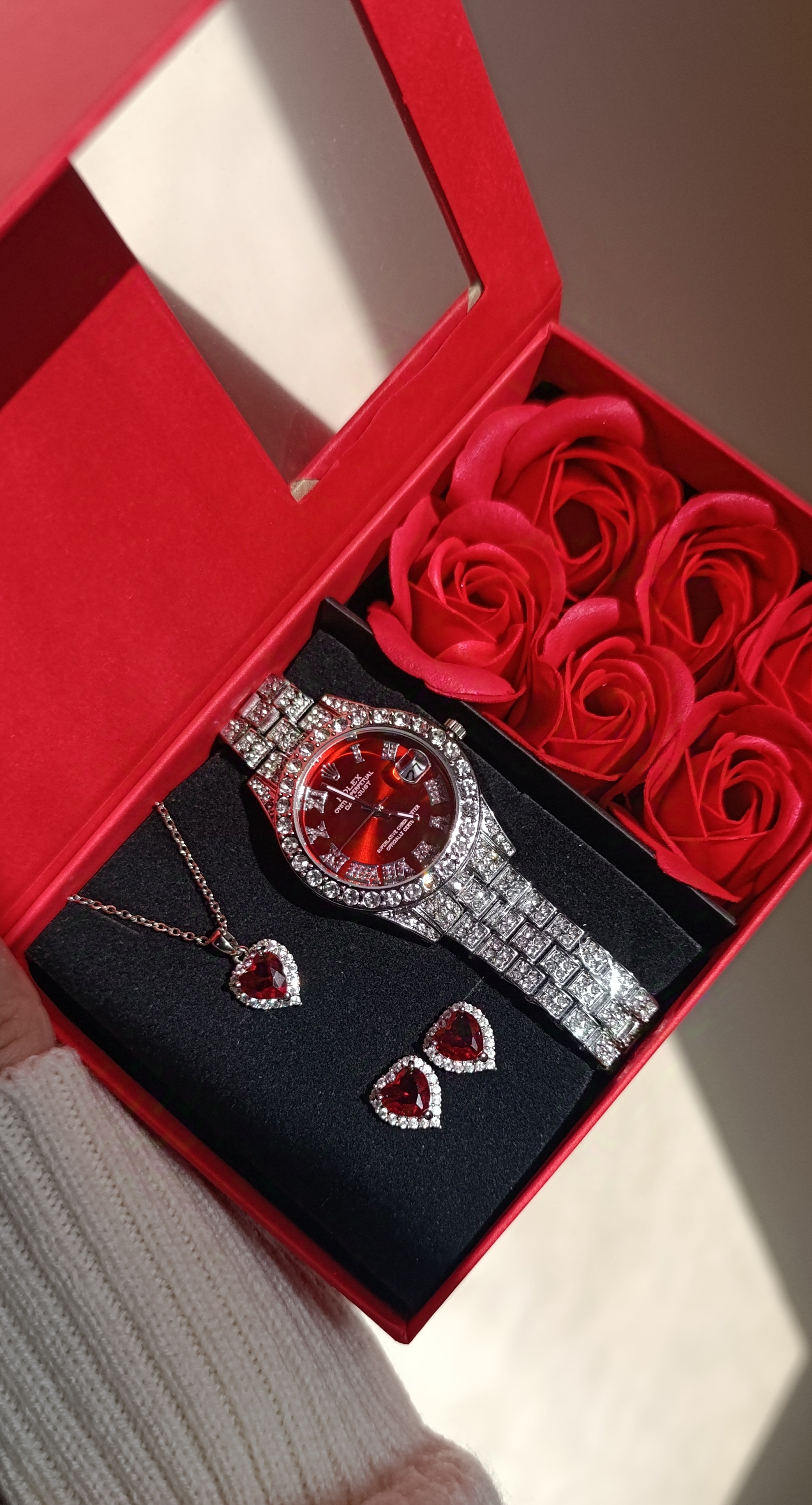 ست ساعت رولکس فول نگین قرمز همراه باکس شش گل قرمز دارای بگ دستی۱٬۶۰۰٬۰۰۰ 5%
