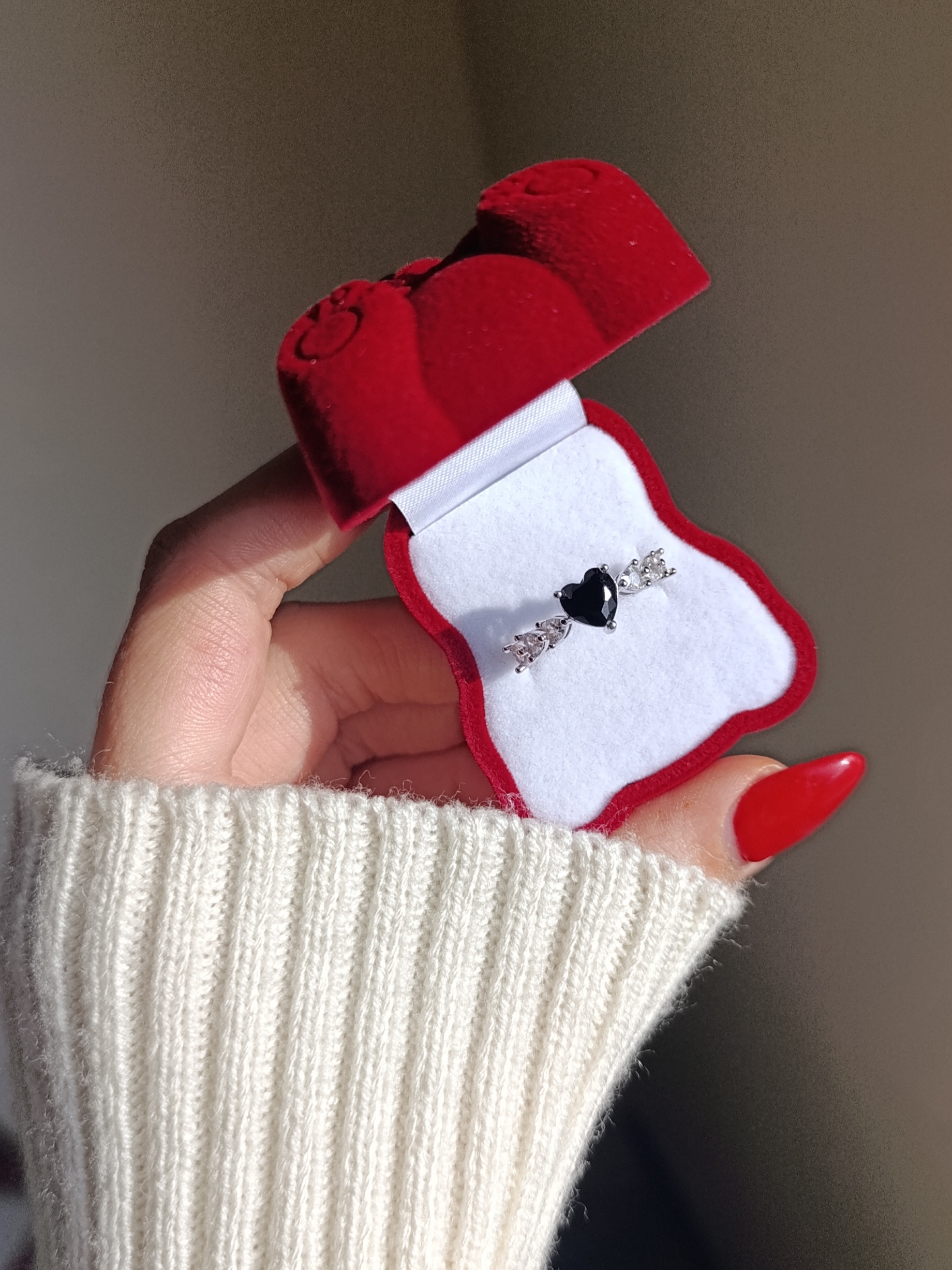 انگشتر نگین قلبی مشکی همراه باکس انگشتر خرسی قرمز