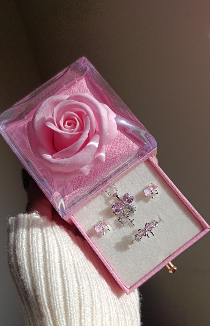 ست گردنبند انگشتر و گوشواره پاپیونی صورتی با باکس گل جاودان صورتی