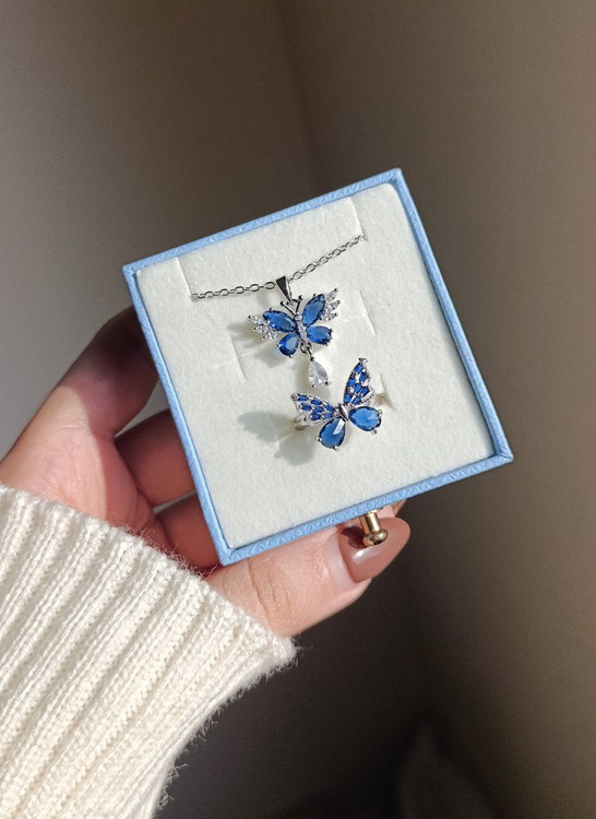 ست گردنبند و انگشتر پروانه آبی همراه باکس گل جاودان آبی