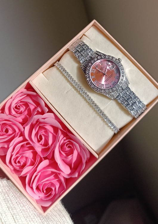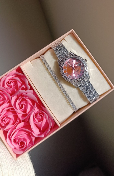 ساعت فول نگین رولکس صفحه صورتی دارای روز شمار استیل و رنگ ثابت مناسب استفاده روزمره (داخل حموم استفاده نشه) موتور و باتری قابل تعویض دستبند تنیسی نگین باگت سفید رنگ ثابت نگین ها بدون ریزش