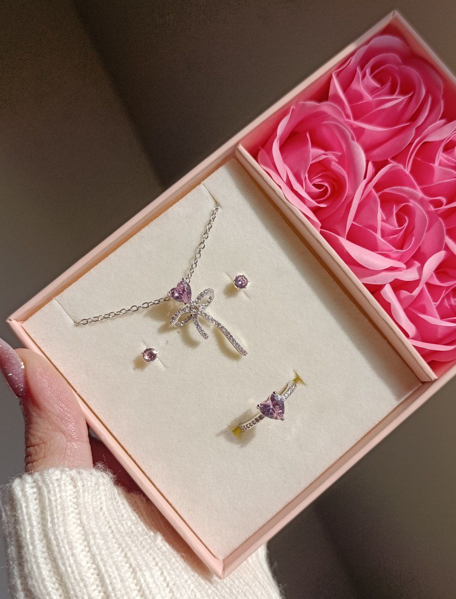 / نیم ست شامل انگشتر گردنبند و گوشواره / کل پک(انگشتر گردنبند گوشواره و باکس شش گل صورتی)