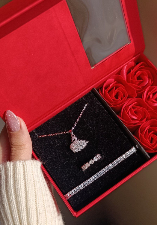 این ست شامل گردنبند قو انگشتر و دستبند تنیسی سفید(انگشتر فری سایز) طول دستبند تنیسی۱۸سانت همگی رنگ ثابت مناسب استفاده روزمره (داخل حموم استفاده نشه) نگین ها بدون ریزش