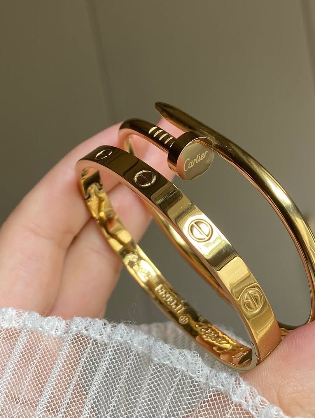 بنگل کارتیر طلایی دارای حک750 استیل و رنگ ثابت مناسب استفاده روزمره سایز دو مناسب مو های متوسط ( اگه مچ دستتون خیلی تپل نباشه به راحتی اندازه میشه) بنگل میخی هم همینطور استیل و رنگ ثابت مناسب استفاده روزمره سایز 2