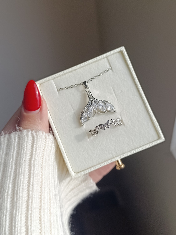 نیم ست گردنبند دم وال سفید و انگشتر پروانه ریز