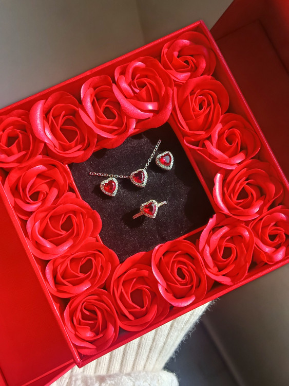 این پک ولنتاینی شامل نیم ست قلب قرمز(گردنبند انگشتر و گوشواره) استیل و رنگ ثابت مناسب استفاده روزمره داخل حموم استفاده نشه ❌ و باکس ۱۶ گل قرمز
