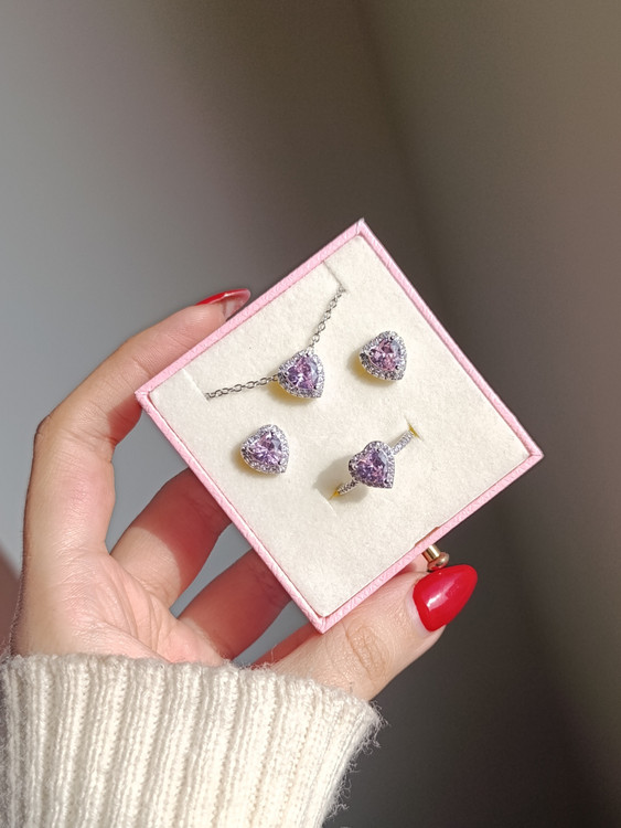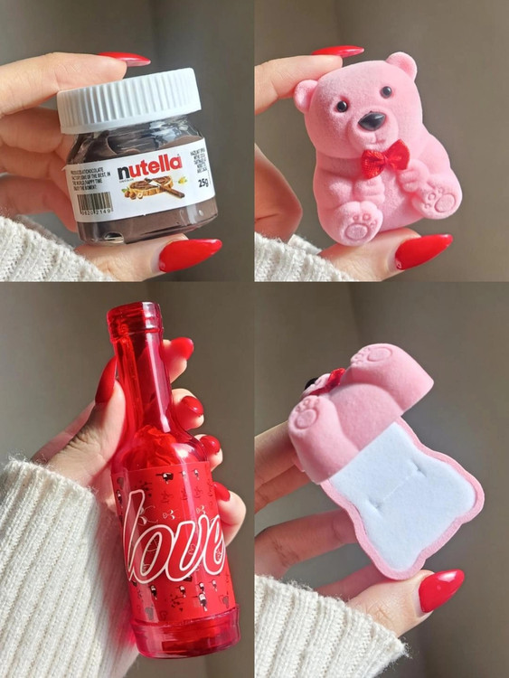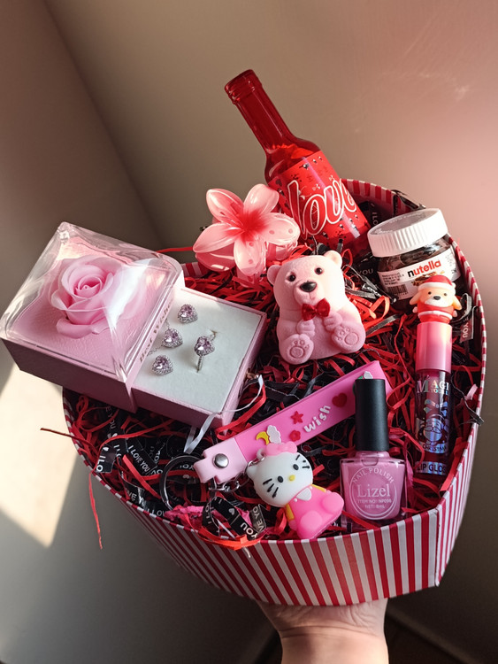مشخصات:: پک ولنتاینی صورتی شامل:باکس قلبی و پوشال(باکس قلبی هم صورتی هست به علت نور قرمز افتاده تو عکس)کلیپس پلومریا،اسمارتیز شامپاینی،نوتلا🍫باکس تک گل صورتی،نیم ست صورتی،لاک صورتی،لیپ گلاس صورتی،جاکلیدی کیتی،باکس انگشتر خرسی صورتی