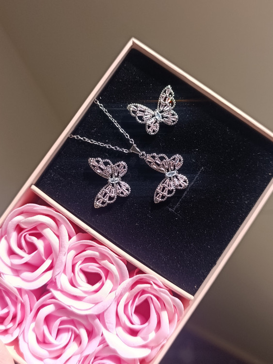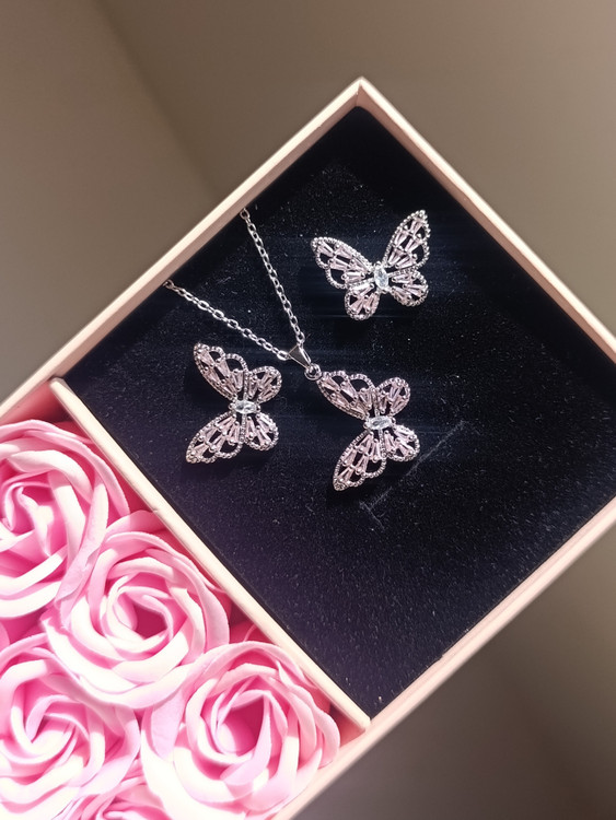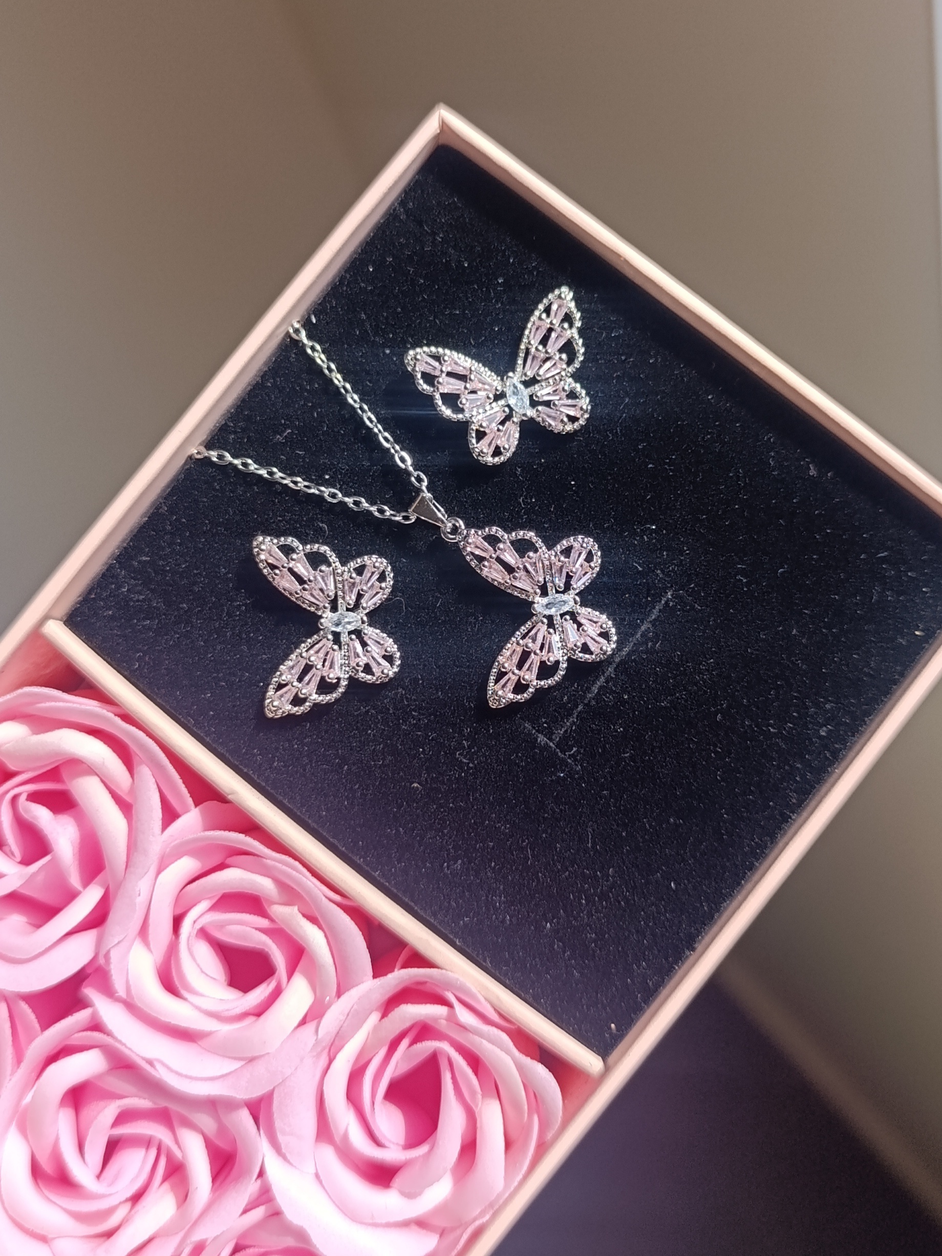 این نیم ست شامل گردنبند و گوشواره پروانه صورتی، گوشواره ها میخی، استیل و رنگ ثابت ضد حساسیت، نگین ها بدون ریزش داخل حموم استفاده نشه ❌