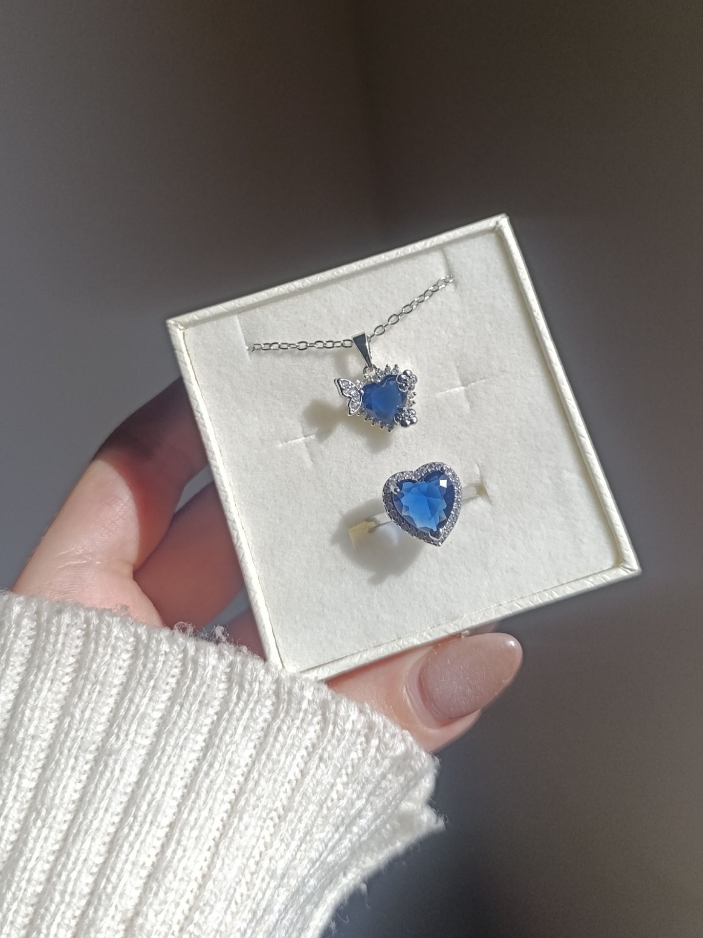 این نیم ست شامل انگشتر و گردنبند نگین آبی، انگشتر فری سایز ، هردو استیل و رنگ ثابت مناسب استفاده روزمره داخل حموم استفاده نشه ❌