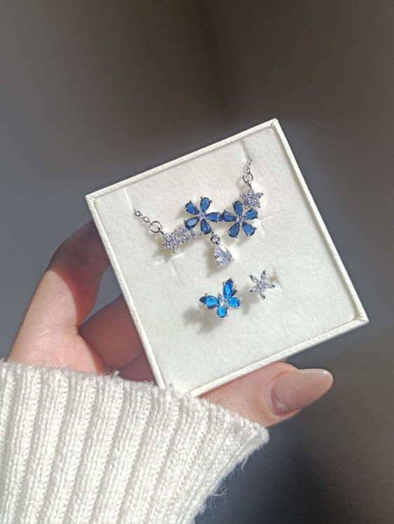 نیم ست گردنبند و انگشتر نگین آبی گل