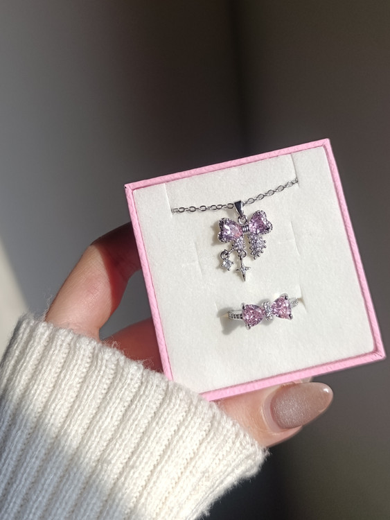 نیم ست گردنبند و انگشتر پاپیون نگین صورتی، انگشتر فری سایز، گردنبند و انگشتر استیل و رنگ ثابت مناسب استفاده روزمره داخل حموم استفاده نشه ❌ نگین ها بدون ریزش