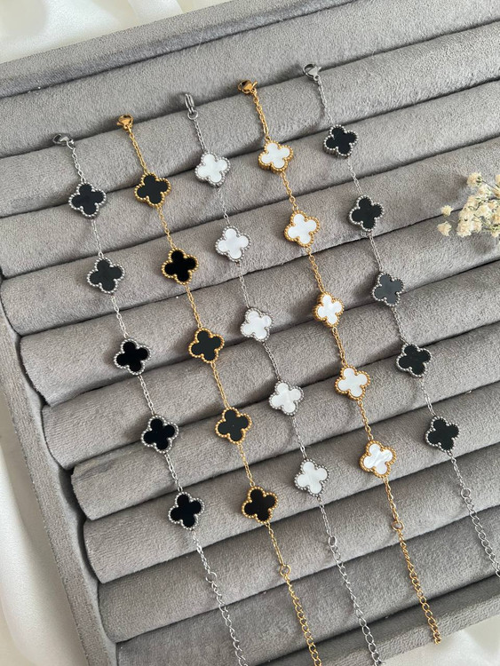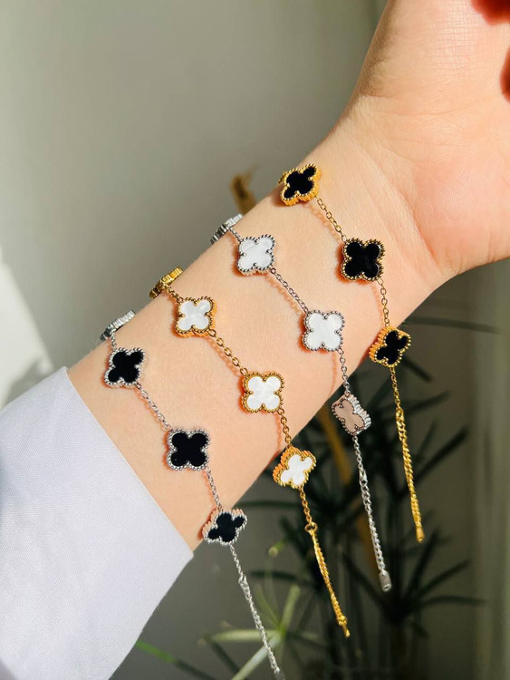 دستبند پنج گل ونکلیف موجود در چهار رنگ استیل و رنگ ثابت مناسب استفاده روزمره ( داخل حموم بهتره استفاده نشه)ونکلیف ترند این روز هاست طول دستبند۲1cm پنج سانتیمتر زنجیر اضافه
